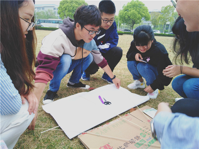 随后,经过简单的分组,团辅活动进入到“我说你画”环节。在主持人宣读完游戏规则后,各小组成员展开激烈的讨论,集思广益,建言献策。同学们团结合作,在活动中擦出友谊火花,欢声笑语回荡在草坪上。最后进行的“放飞青春”风筝制作环节将活动气氛推向了高潮。同学们围坐在草坪上,分工合作,将零散的支架条扎成风筝骨架,在油纸上挥洒自己的创意与灵感,即使是天空飘起的濛濛细雨也没能阻挡同学们的热情。