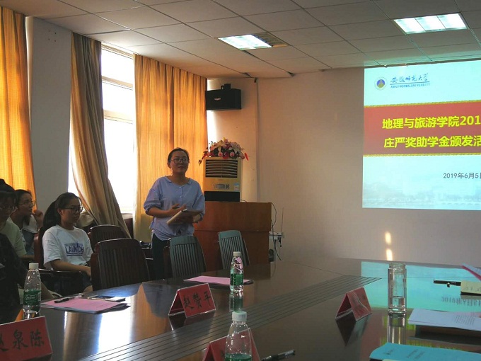 本网讯(地旅学院 陈健)6月5日,beat365英国官方网站2018-2019学年庄严奖助学金(第二批次)颁发活动暨座谈会在学院行政楼三楼会议室顺利举行。庄严基金会代表赵泉陈、赵赞平、杨晶晶,地旅学院院长苏勤、党委书记贾冠忠、党委副书记乔静、辅导员代表以及获奖受助学生代表参加了本次活动。