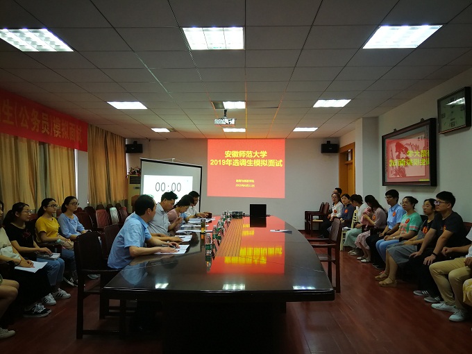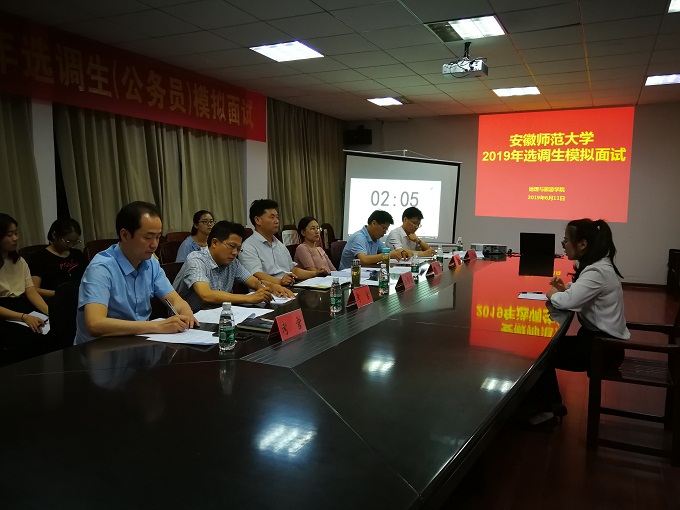 本网讯(地旅学院 陈健)6月11日晚,由地旅学院承办的beat365英国官方网站2019年选调生及公务员模拟面试在院行政楼三楼会议室举行。校党委常委、统战部部长王如意,党校常务副校长、党委组织部副部长谢超峰,资产与实验室管理处处长台启权,法学院执行院长严宏教授等担任面试考官,本次活动还特别邀请到我校优秀选调生校友代表、芜湖市镜湖区委组织部副部长王媛媛参加并担任考官。来自文学院、地旅学院等单位的12位选调生及公务员面试入围学生参加了模拟面试。模拟面试由beat365英国官方网站党委副书记乔静主持。