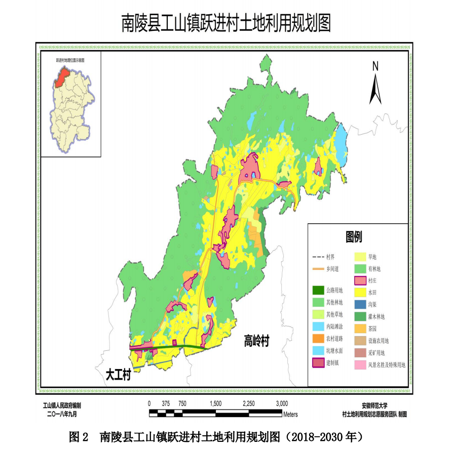 此次村土地规划志愿服务,团队选择南陵县工山镇跃进村为调研目的地。在为时七天的调研活动中,队员们首先在村委会获取了村内的人口、经济等基本资料。此外团队还采取问卷调查的形式,向村民询问了村内生产、生活方面的基本情况和其对村内规划发展的理想愿景。在实践的内业工作中,团队采用跃进村“第二次全国土地调查”的数据,结合外业问卷调查的数据挖掘成果,以满足大部分村民的基本愿景,提高其乡村生活的幸福指数为目的,对跃进村的生活、生产、生态空间进行了合理的规划布局,最终完成规划作品《南陵县跃进村土地利用规划(2018-2030 年)》。