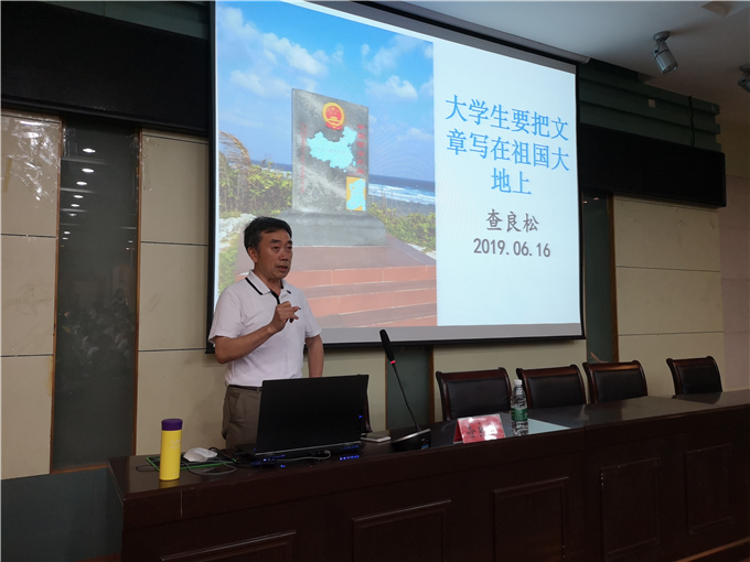 本网讯(地旅学院 金驰)为了使学院2018级本科生树立远大理想,认真对待大学学业生涯,2019年6月16日晚7点,校关工委查良松教授应邀在beat365英国官方网站实验楼101报告厅作“大学生要把文章写在祖国大地上”主题讲座。本次讲座由查良松教授主讲,辅导员吴文涵主持,beat365英国官方网站2018级本科生参加。