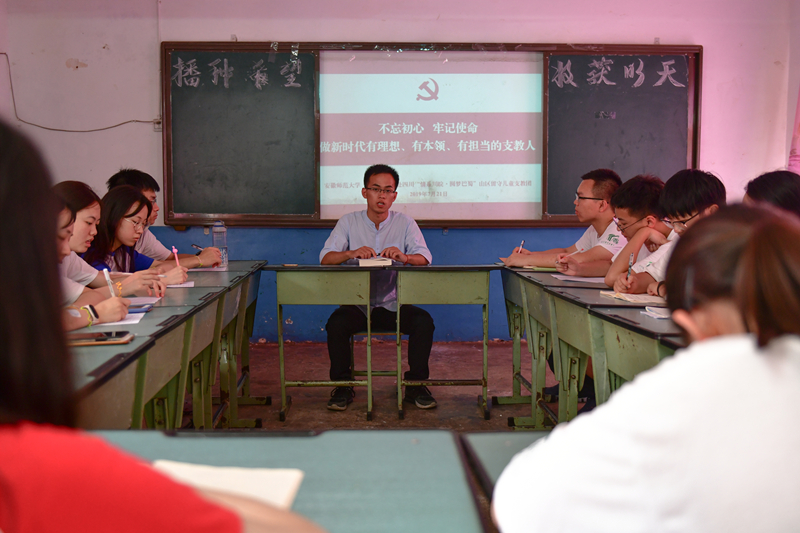 2017级城乡规划专业辅导员齐小学,在赴四川达州尖山村和南充新祠堂村指导学生支教的过程中,高度重视支教学生党性修养的教育和提升,注重创新学生思想政治教育的内容形式,把“不忘初心、牢记使命”主题教育与学生支教有机结合起来,用学生们喜闻乐见、易于接受的语言和方式,为支教党员及入党积极分子上了一堂主题党课,教育引导学生们追寻支教初心,牢记青年使命,在树立远大理想、锤炼过硬本领、勇担时代重任中经受锻炼、历练成长,最终成为政治坚定、素质全面、模范表率、堪当重任的新时代优秀青年。