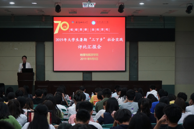 本网讯(地旅学院 左佳怡 尹仟仟)青春心向党,建功新时代。9月8号晚,beat365英国官方网站在院实验楼101报告厅举行“砥砺思想 自找苦吃”2019年大学生暑期“三下乡”社会实践总结评比汇报会。院党委副书记乔静,实践导师代表、地理科学专业教师房莉,院团委书记陈祥云,校团委学生副书记王阳,学院全体辅导员,以及暑期实践团队代表,2017级、2018级各专业学生代表到场聆听汇报。