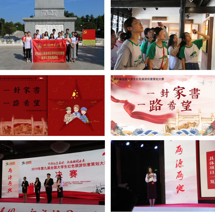 大赛以“祝福祖国母亲·传承红色基因”为宗旨,围绕金寨的红色文化资源,设计制作红色旅游路线、创意策划产品和创意营销微视频。由我校2019级旅游管理研究生徐倩、2016级旅游管理鲍晓楠、2017级行政管理吴德超、2018级地理信息科学李露露、2017级工艺美术冀珂珂等同学组建的“小希望”团队,凭借作品《一封家书·一路希望》取得创意策划产品组第5名的成绩,荣获三等奖。该团队指导教师尹寿兵、蔡善柱等荣获大赛“最佳指导教师”。
