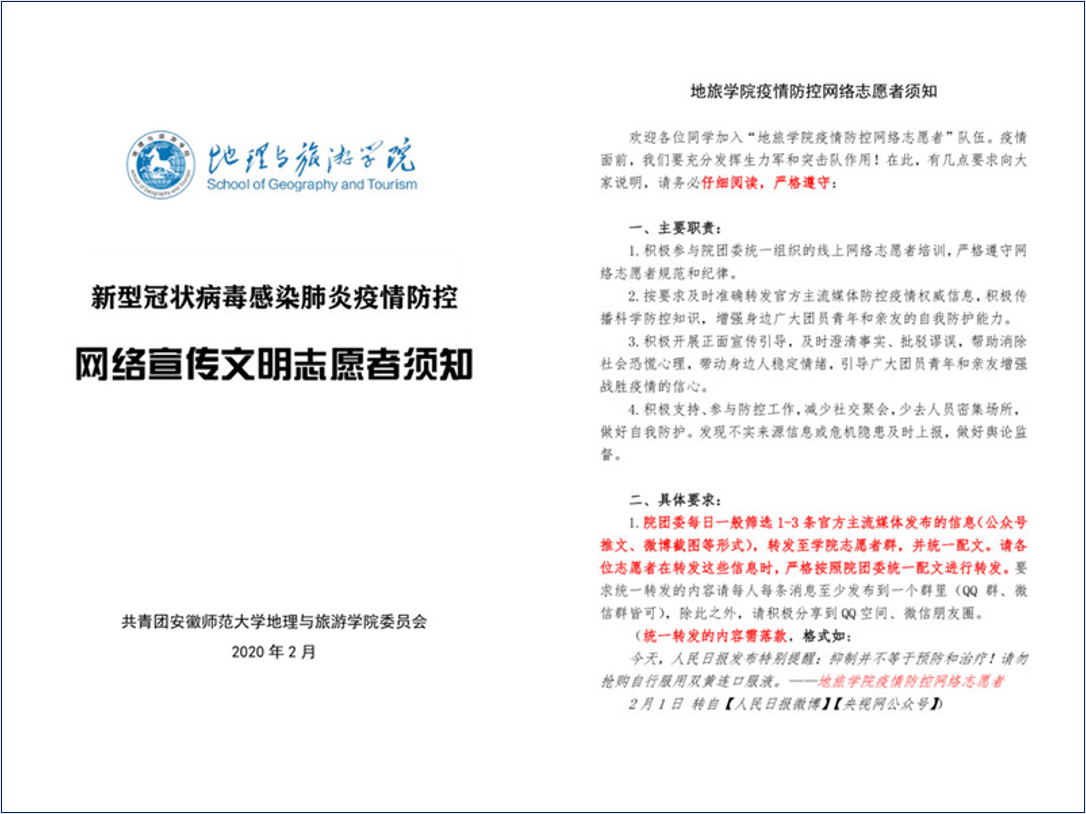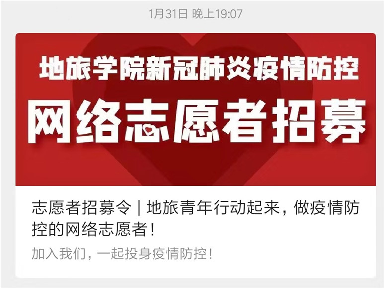 本网讯(地旅学院 尹仟仟)当前,全面防控新型冠状病毒感染肺炎疫情进入关键时期,为响应党中央、团中央立即行动起来、投身疫情防控的号召,地旅学院迅速行动,积极在全院本科生党员、入党积极分子和团员骨干中招募“新型冠状病毒感染肺炎疫情防控网络宣传文明志愿者”,大力宣传科学防控知识举措,转发官方权威信息,抵制谣言,共同传播正能量,构建清朗网络空间。活动自1月27日启动筹划,1月31日通过地旅学院团委官方微信公众号发布“招募令”,采取线上报名方式招募志愿者,截止2月7日,已招募来自学院各年级、专业的426人加入疫情防控网络文明志愿者队伍。