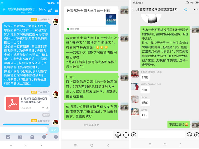 地旅学院旅游本科生党支部书记、院团委书记陈祥云介绍:“我们要求志愿者们统一转发的信息,在选择时一定是慎之又慎。并且,为了体现内容规范性和可靠性,每条统一转发的信息都由我本人确定和发布,并要求志愿者按照统一格式配文,注明信息来源,亮明疫情防控网络志愿者身份。志愿者们也都积极响应、严格执行。‘规定动作’一定要做到‘有模有样’!”