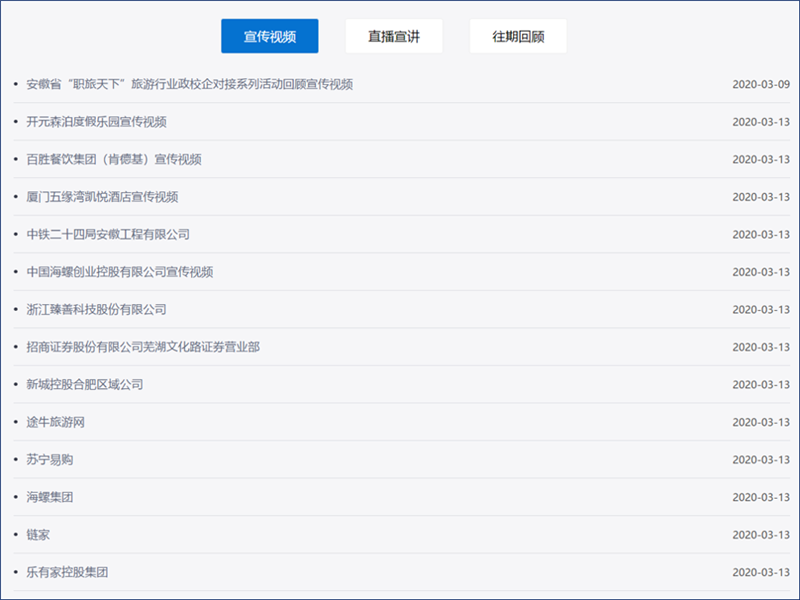 本网讯(地旅学院 陈祥云)为全力做好新冠肺炎疫情防控期间高校毕业生就业促进工作,服务长三角高质量一体化发展国家战略和安徽省“旅游强省”建设目标,2020年3月,安徽省第五届“职旅天下”旅游行业政校企在线对接活动暨高校公益网上招聘会成功举办。该活动由安徽省文化和旅游厅、beat365英国官方网站主办,beat365英国官方网站招生就业处、beat365英国官方网站承办。在往年活动的基础上,本届活动首次创新采取“互联网+就业”形式,活动平台暨空中双选会专题招聘网站于3月8日正式上线,截止目前,已有省内外和长三角地区文化、旅游、教育及相关行业的180家招聘单位参与本次网上招聘活动,共计为毕业生提供5432个招聘岗位,吸引来自我校和安徽大学、安徽财经大学、淮北师范大学等全省10余所高校21900人次毕业生参与活动。