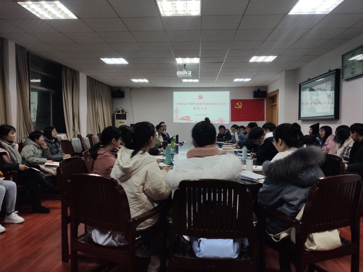 本网讯(地旅学院 罗勇 齐小学)12月29日晚,地理本科生党支部在学院行政楼三楼会议室召开党员大会,讨论决表决王琨、余何愚、尚娜娜、沙雪琴、丁茹栩等5名预备党员转正事宜,党支部在校正式党员、预备党员参加会议,到会有表决权的正式党员人数符合法定要求。会议由党支部书记齐小学主持。