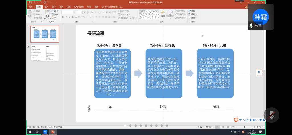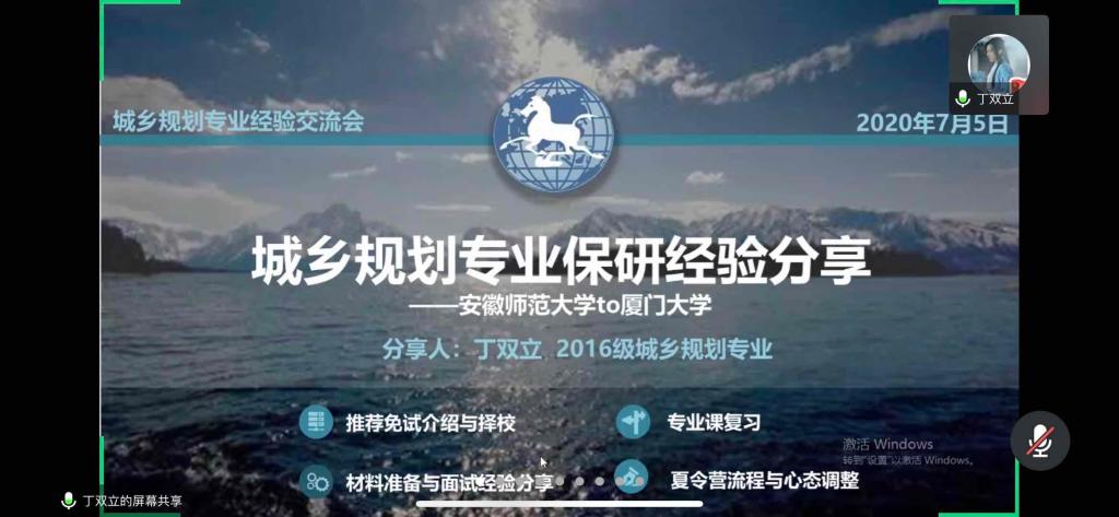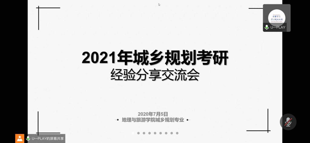 本网讯(地旅学院 王竞钊)为充分对2021年学生做好考研指导,7月5日上午,城乡规划专业利用网络会议的方式开展了2021年考研经验分享交流会,会上邀请来自2016级多位成功升学的同学做了经验分享,参加会议的还有城乡规划专业教师姚景艳以及2017级全体学生。