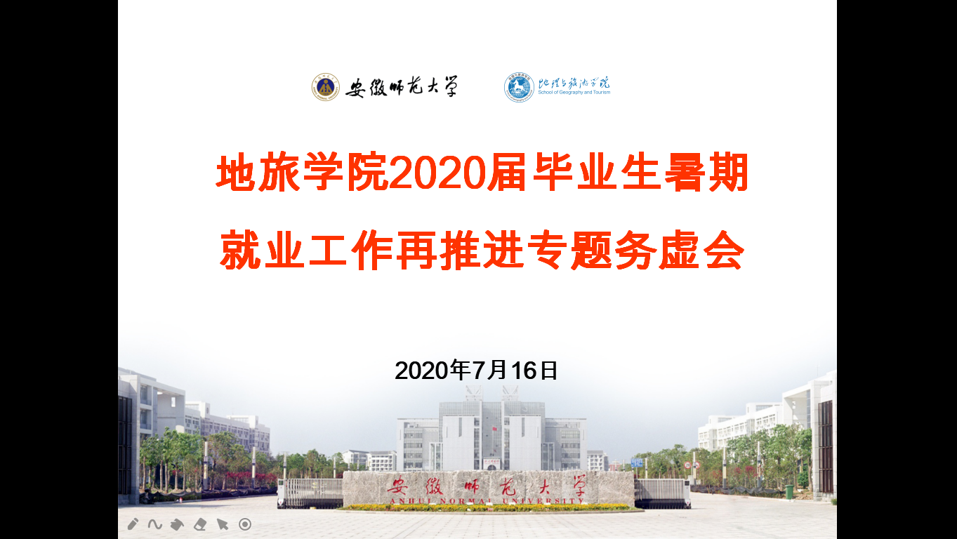 本网讯(地旅学院 韩红豆)为进一步推进毕业生就业工作,7月16日,地旅学院召开2020届毕业生暑期就业工作再推进专题务虚会,学院党委副书记乔静、团委书记陈祥云、钱程老师以及全体毕业班辅导员参加此次线上会议。