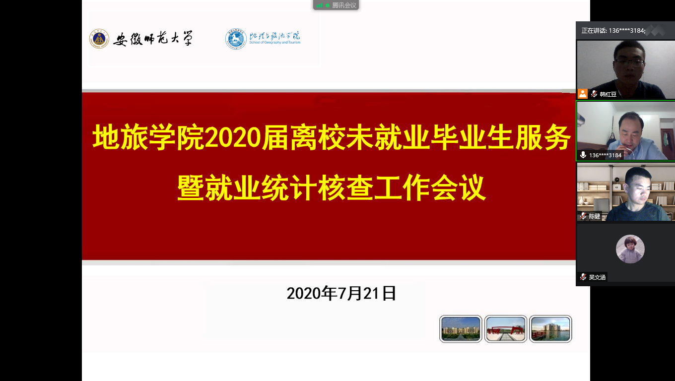 本网讯(地旅学院 韩红豆)为进一步推进落实未就业毕业生服务以及就业统计核查工作,7月21日,地旅学院召开2020届离校未就业毕业生服务暨就业统计核查线上工作会议,学院党委副书记乔静、全体毕业班辅导员参加会议。