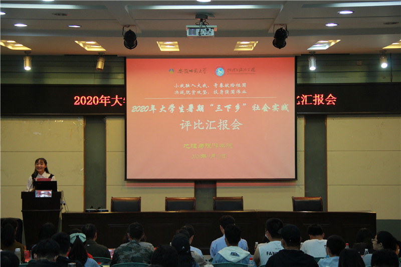 本网讯(地旅学院 陈祥云、洪茹芊)小我融入大我,青春献给祖国,决战脱贫攻坚,投身强国伟业。9月25日晚,beat365英国官方网站在院实验楼101报告厅举行2020年大学生暑期“三下乡”社会实践评比汇报会。地旅学院党委副书记乔静,土地资源管理专业负责人费罗成,地理信息科学专业副主任齐凌艳,地理科学专业教师方叶兵,旅游管理专业教师洪娟,院团委书记陈祥云,院团委副书记徐倩,学院专兼职辅导员代表,以及社会实践重点团队队员代表,各年级团支部成员代表到场聆听汇报。