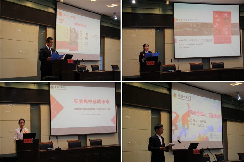 经团支部申报和学院初选,共有19名来自全院各年级各专业的学生脱颖而出,进入最终的评比汇报环节。参评学生按序上台汇报演讲,用PPT展示全方位展示个人事迹和荣誉。他们分别从学习、工作、实践、生活、志愿服务等方面,讲述自己在花津河畔的成长故事,充分展现了地旅学院青年学生骨干奋发进取的精神和顽强拼搏的意志。