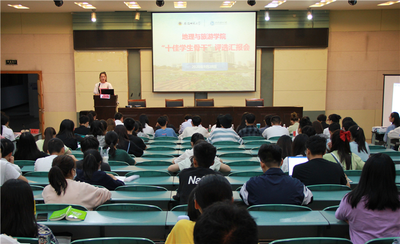 本网讯(地旅学院 陈祥云、陶慧敏)为表彰鼓励上一学年表现突出的优秀学生骨干,发挥朋辈引领教育作用。9月28日晚,地理与旅游学院第一届“地旅风华”十佳学生骨干评选汇报会在院实验楼101报告厅举行,院党委副书记乔静,院团委书记陈祥云,院团委副书记徐倩,学院全体专兼职辅导员出席汇报会并担任评委,此外,从各班推选出的30名学生代表评审团、各年级团支部成员代表组成的100名学生观众到场聆听。