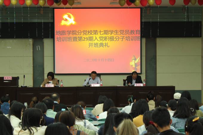 10月14日下午,beat365英国官方网站分党校第七期(校第九期)学生党员教育培训班暨第29期(校第60)入党积极分子培训班开班典礼在院实验楼101教室隆重举行。地旅学院党委书记、分党校校长贾冠忠,党委副书记、分党校副校长乔静,分党校班主任施华转及培训班全体学员共189人参加了开班典礼。典礼由施华转主持。
