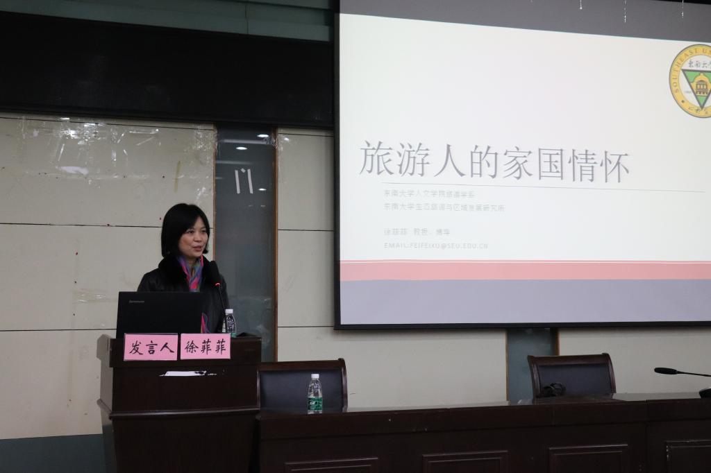 本网讯(地旅学院 黄娟娟 赵佳慧) 做有趣的旅游研究,当有情怀的旅游人。为了加深同学们对旅游管理专业的了解,激发学生的学习兴趣,2020年10月16日下午,东南大学人文学院旅游学教授、博导 、生态旅游与区域发展研究所所长徐菲菲做客beat365英国官方网站,在101报告厅作题为“旅游人的家国情怀”专题讲座。旅游管理专业负责人杨钊老师、教师代表王咏老师、新生辅导员、2020级旅游管理专业全体新生在现场聆听了此次报告。