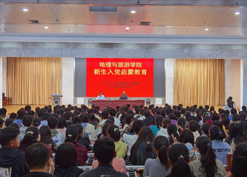 本网讯(地旅学院 赵佳慧 吴思慧)为引导2020级新生正确认识端正入党动机的重要性,进一步加强对党的认识,帮助树立崇高精神追求,坚定理想信念,鼓励优秀新生积极向党组织靠拢。10月29日上午,地理与旅游学院2020级新生入党启蒙教育专题报告在花津校区理科大楼一楼报告厅隆重举行,校党委组织部正处级组织员胡培亮应邀作为主讲人,地旅学院党委书记贾冠忠担任此次报告主持。