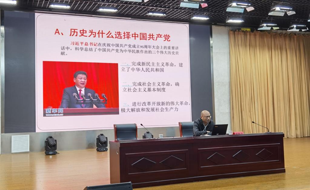 报告伊始胡培亮从“历史为什么选择中国共产党”这个问题展开话题讨论,就习近平总书记在中国共产党成立95周年大会上的重要讲话中总结的中国共产党三个伟大历史贡献:完成新民主主义革命,建立中华人民共和国;完成社会主义革命,确立社会主义基本制度;进行改革开放新的伟大革命,极大解放和发展社会生产力。胡培亮针对这三大历史贡献逐一进行详细讲解,结合太平天国农民起义、戊戌变法、辛亥革命以及中国共产党的成立四个历史片段带领同学们进行学习,向同学们介绍了中国共产党的党史,让同学们对党有了更加深刻、具体的了解。
