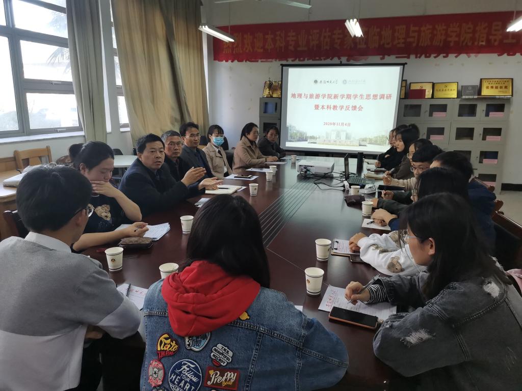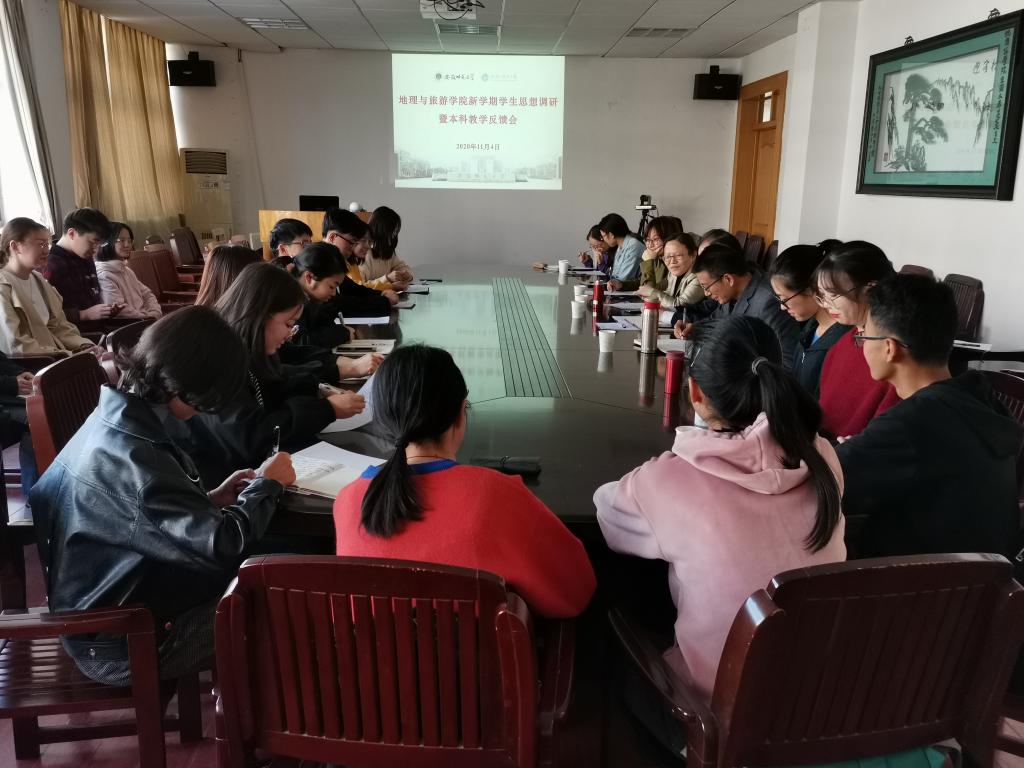 本网讯(地旅学院 赵佳慧)为贯彻落实学校《关于开展新学期学生思想情况调研工作的通知》(〔2020〕9号)文件精神,进一步加强新学期学生管理,深入倾听学子心声,11月4日下午,地旅学院召开2020年新学期学生思想调研暨教学反馈座谈会,根据专业划分成地理土管、旅游酒店、地信城规三个分会场。地旅学院领导班子成员、各专业负责人、全体专兼职辅导员以及学生代表按专业分会场参加了座谈会。