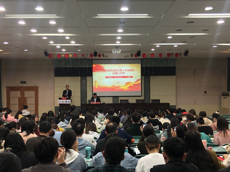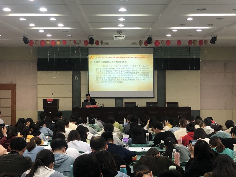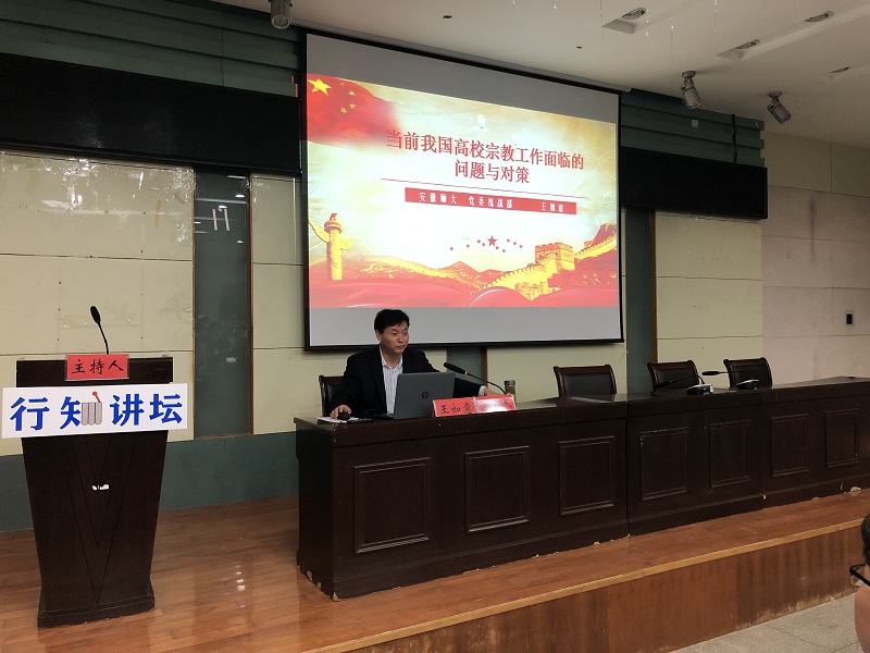本网讯(地旅学院 褚超群 王美) 树人树德,育人育心。11月1日上午,beat365英国官方网站邀请了校党委统战部常务副部长王如意做客“行知讲坛”,为分党校学员讲授《当前我国高校宗教工作面临的问题与对策》主题党课。地旅学院党委副书记乔静主持报告会,辅导员代表及学生党员、入党积极分子共同参加了学习。