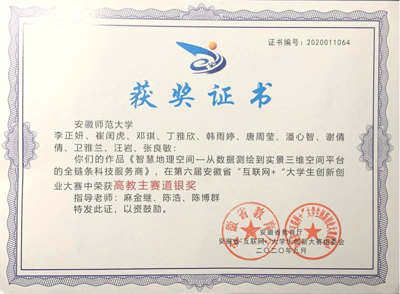 本网讯(地旅学院 李正妍)近日,由安徽省教育厅与合肥市人民政府联合主办,合肥工业大学、合肥学院、合肥职业技术学院和合肥市教育局共同承办的第六届中国国际“互联网+”大学生创新创业大赛选拔赛暨安徽省“互联网+”大学生创新创业大赛圆满落下帷幕。2017级地理信息科学专业李正妍、崔闰虎、2018级地理信息科学专业邓琪等同学,在我校地旅学院麻金继教授、物电学院陈浩老师、创新创业学院陈博群老师指导下组队参赛。经过校级初赛、网络评选、线上路演三个环节的激烈角逐,最终获得了高教主赛道省级银奖。