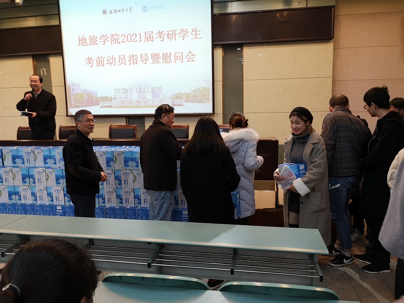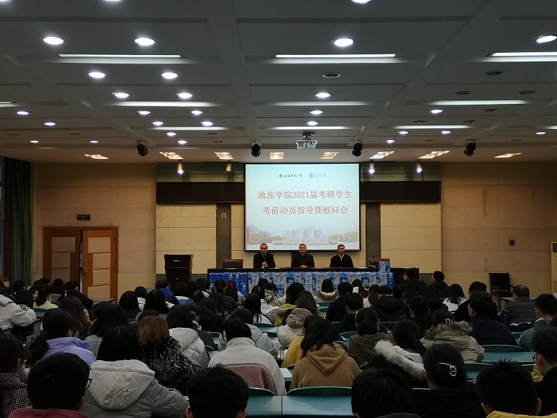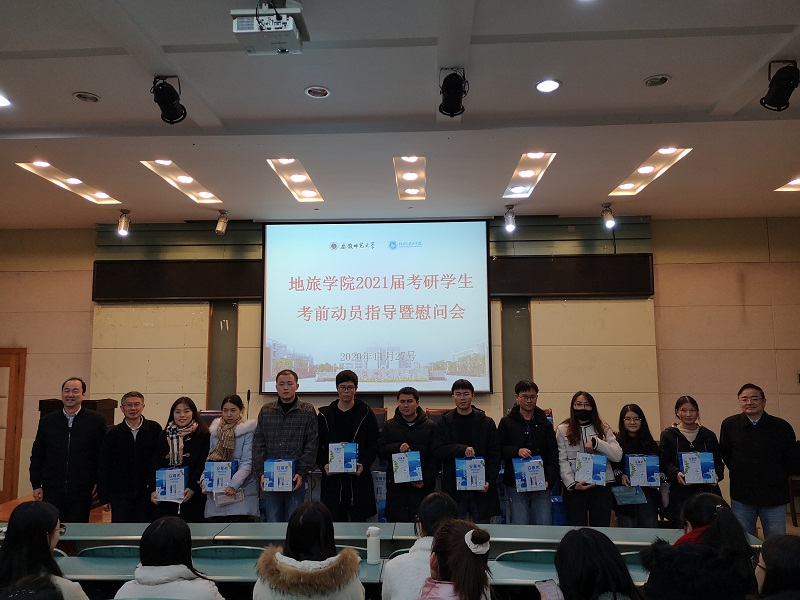 本网讯(beat365英国官方网站 王美)11月27日下午,地旅学院在院实验楼101报告厅召开地旅学院2021届考研学生考前动员指导暨慰问会。院党委书记贾冠忠、院长苏勤、院党委副书记乔静、2017级辅导员全体辅导员以及2021届考研学生参加了动员慰问会。会议由院党委副书记乔静主持。