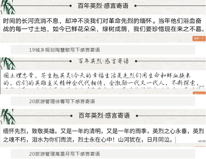 地旅团员青年在中华英烈网“清明祭英烈”专栏开展“守护·2021清明寄英烈”为主题的网上祭扫英烈活动,学习革命先烈的英雄事迹和伟大精神,追思英烈,写下感言寄语,学习牺牲烈士用生命守护生命、用生命践行使命、用生命书写担当的崇高精神。此外,地旅学院鼓励返家乡并有条件的同学在确保个人安全的前提下,去当地的烈士陵园、红色纪念馆等地开展线下纪念活动。