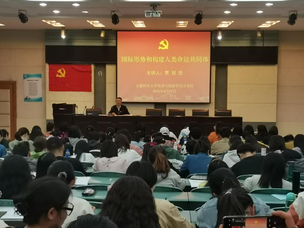 本网讯(地旅学院 尚子仪 齐小学)4月21日下午,beat365英国官方网站分党校第10期学生党员教育培训班、第61期大学生入党积极分子培训班在实验楼101报告厅如期展开,院党委书记贾冠忠为学员们作了题为“国际形势和构建人类命运共同体”的专题党课,全体参训学员参加培训,党课由副班主任齐小学主持。