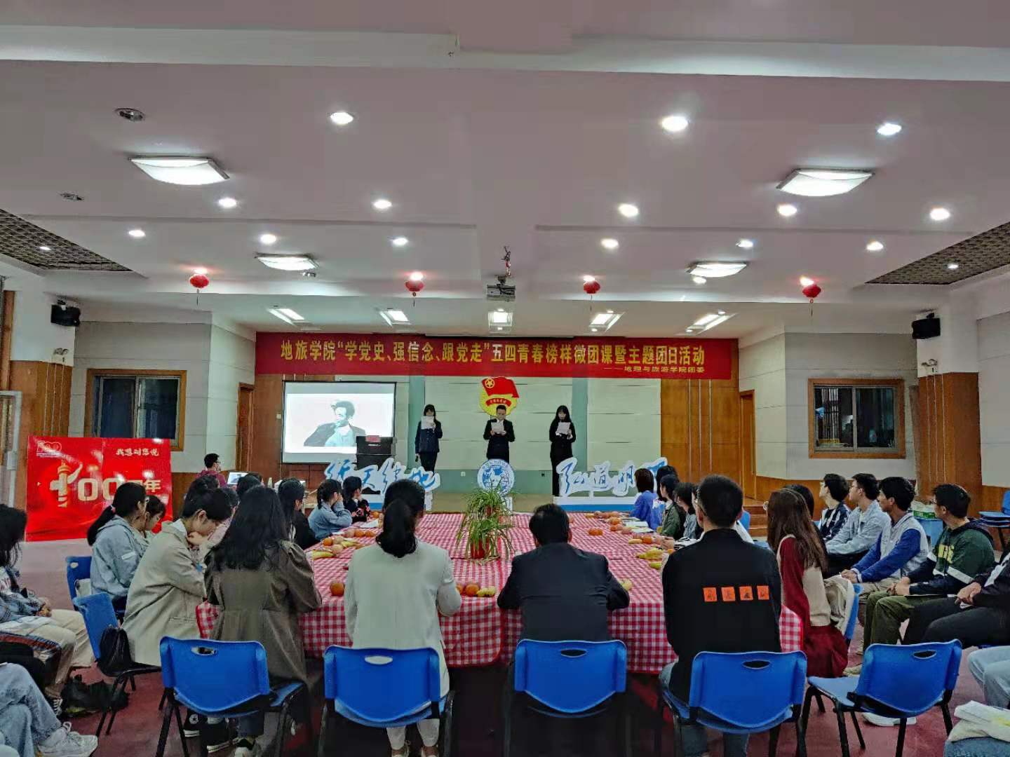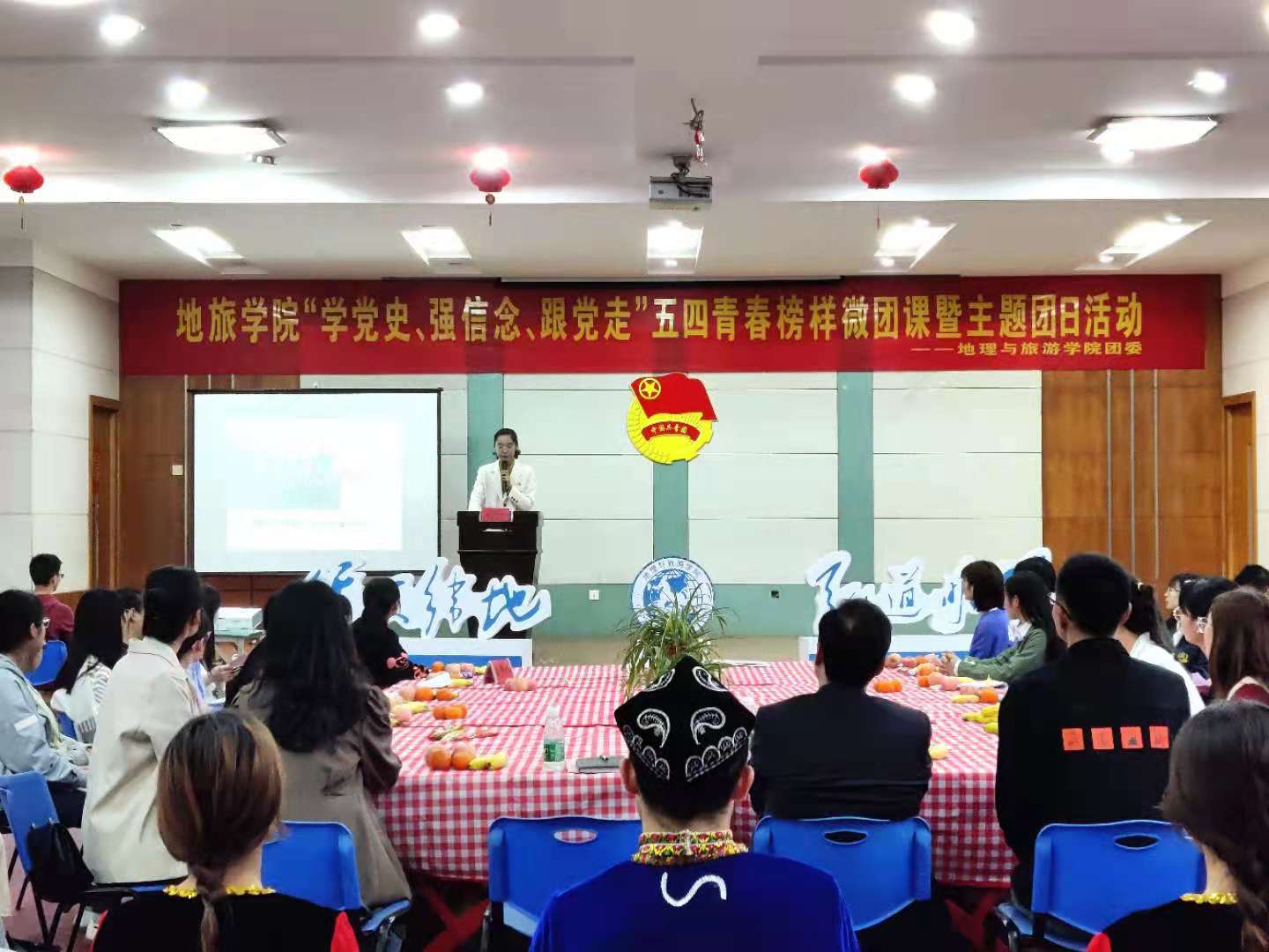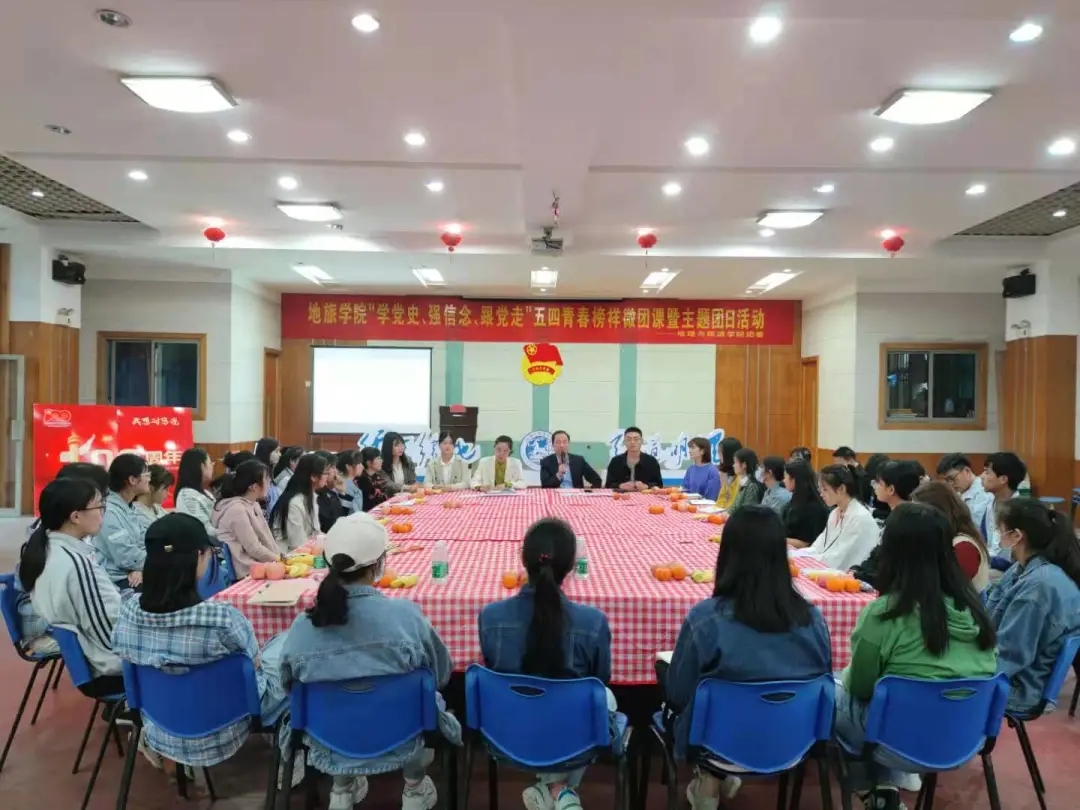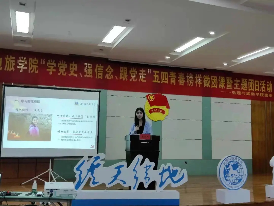 5月4日下午,beat365英国官方网站在地旅实验楼一楼职工小家举办“学党史、强信念、跟党走”五四青春榜样微团课暨主题团日活动。地旅学院党委副书记乔静,地旅学院辅导员韩红豆、赵佳慧、丁茹栩、张慧,以及各班遴选的学院团员青年代表参加此次活动。本次活动由地旅学院团委书记陈祥云主持。本次五四青春榜样微团课分为三讲,分别是:热血、榜样、奋进。三讲课程中间有两次课间表演:分别是新疆舞和诗朗诵。