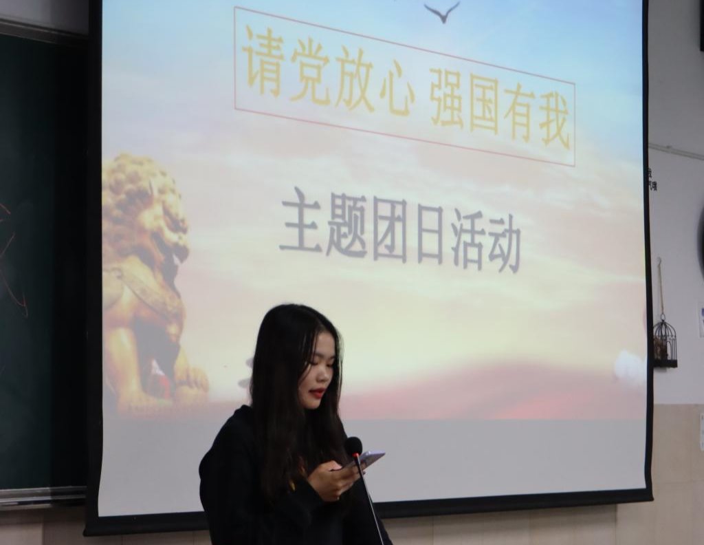 本网讯(地旅学院 韦银艳 陈谊)为认真贯彻落实习近平总书记在庆祝中国共产党成立100周年大会上的重要讲话精神,进一步引导青年大学生把青春奋斗融入党和人民事业,努力成为实现中华民族伟大复兴的先锋力量,2021级旅游管理专业2班10月12日晚间举行了“请党放心,强国有我”主题团日活动。活动由团支书黄倩主持。