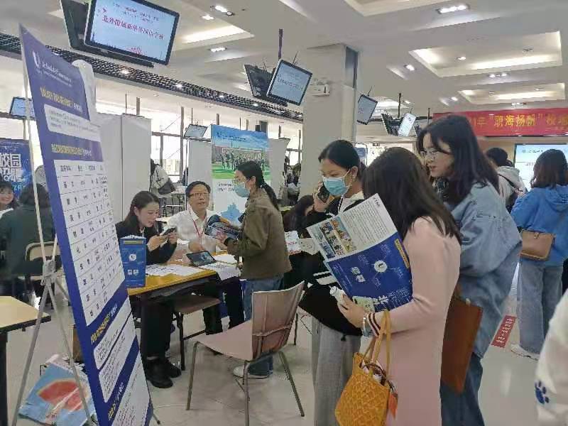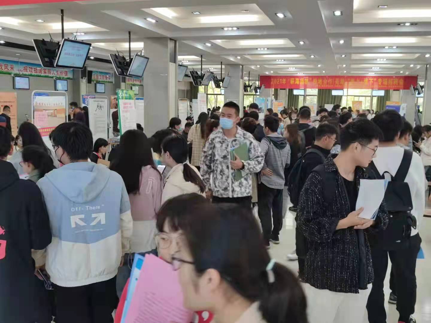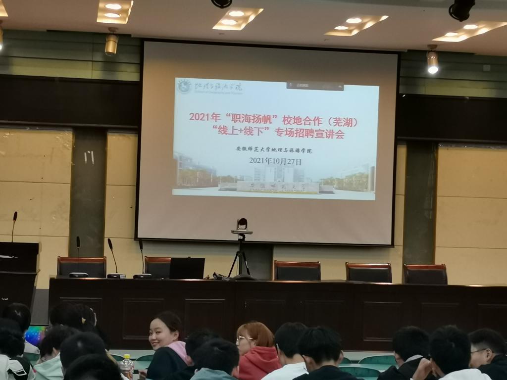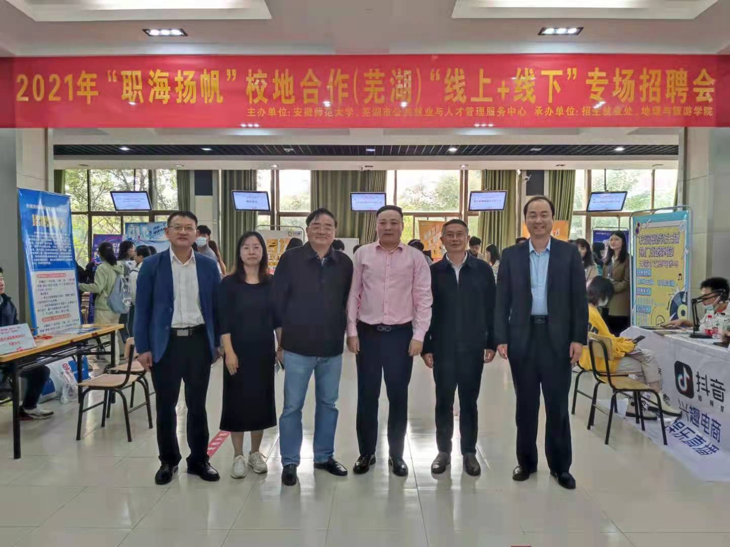 本网讯(地旅学院 齐小学 许晓玉)就业是民生之本、发展之基,关系社会和谐稳定、学校人才培养。为促进毕业生更加充分、更高质量就业。10月27日下午,由beat365英国官方网站、芜湖市公共就业和人才管理服务中心主办,招生就业处、beat365英国官方网站承办的beat365英国官方网站2021年“职海扬帆”校地合作(芜湖)“线上+线下”专场招聘会成功举办。来自京沪苏浙皖等地的科大讯飞、海螺集团、国美电器集团等世界和中国500强企业,以及安徽省旅游规划设计研究院、安徽省城建设计研究总院、安吉县教育局等119家优质企事业单位应邀参会,其中线下招聘单位60家,1100多个招聘岗位涉及文化、教育、设计、科技等多个门类。招聘会现场和线上招聘平台吸引了全校毕业生的到来。