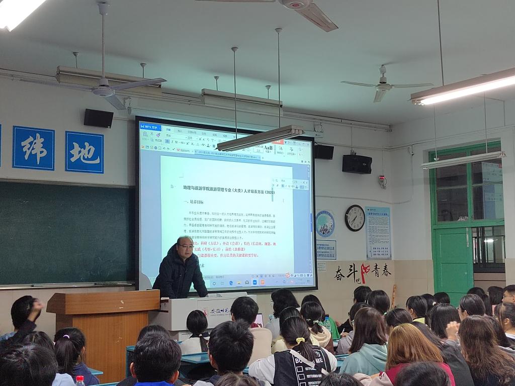本网讯(地旅学院 李炳臻)为加强学生对专业课程和发展目标的了解,帮助大学生更好的规划大学专业学习。地旅学院旅游管理专业负责人杨钊教授在行知楼为2021级旅游管理专业学生专项解读《2021级旅游管理专业大人才培养方案》的解读讲座。