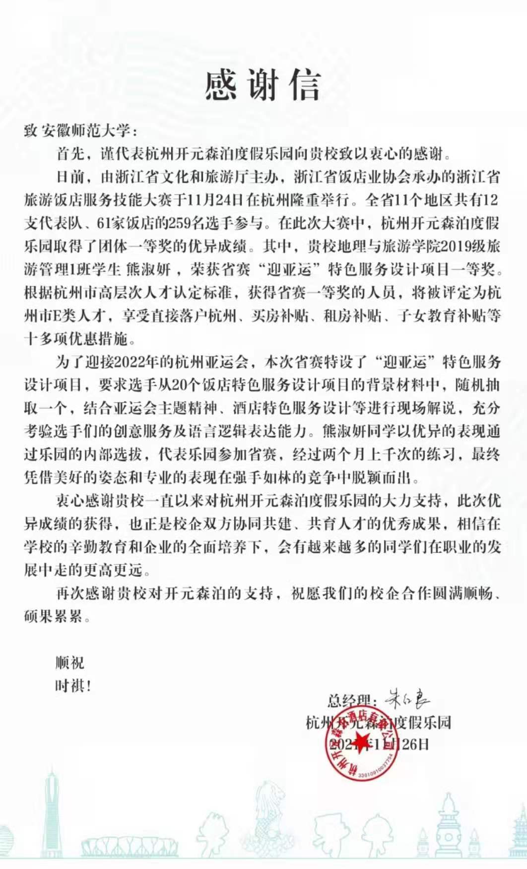 我校旅游管理专业校外实习就业基地、本次参赛推荐单位——杭州开元森泊度假乐园,为感谢学校一直以来的大力支持和祝贺校企双方协同共建、共育人才的优秀成果,特发来感谢信,信中写到:“衷心感谢贵校一直以来对杭州开元森泊度假乐园的大力支持,此次优异成绩的获得,也正是校企双方协同共建、共育人才的优秀成果,相信在学校的辛勤教育和企业的全面培养下,会有越来越多的同学在职业的发展中走的更高更远”。