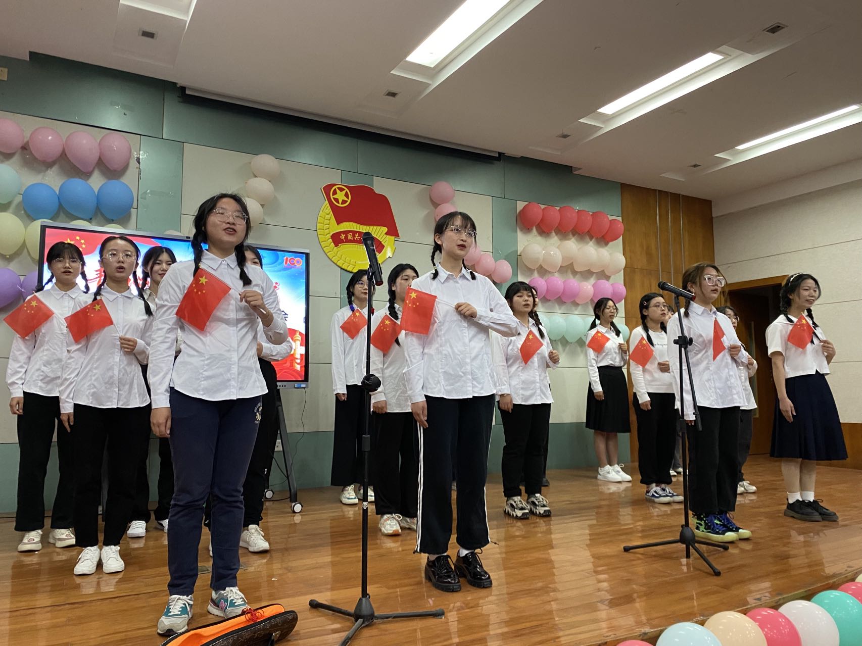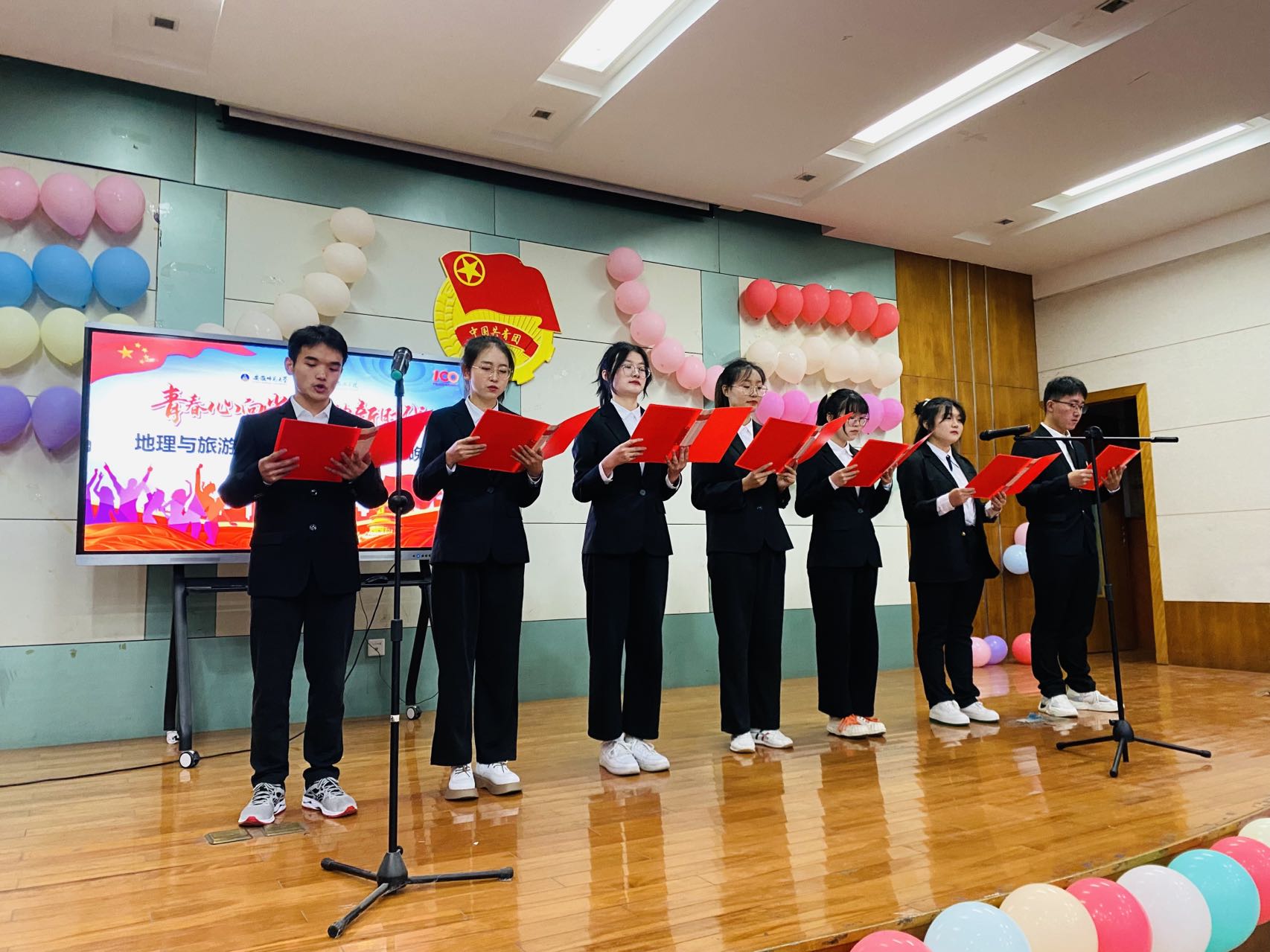 第三篇章:逐梦。乘风破浪,逐梦万里。由2021级地理科学(师范)专业丁心怡同学选送的歌曲《稻香》唱出了青年内心的坚强与自信,乐观与勇敢,寻找家的力量,给在外奔波的追梦人坚持下去的勇气。由2021级旅游管理专业选送的《少年中国说》歌颂了少年的朝气蓬勃,也唱出了当代中国青年发奋图强的精神风骨,勉励新时代青年要勇担重任,胸怀世界,不忘初心,不负时代。晚会在合唱《光荣啊,共青团》中落下帷幕,团员青年代表唱出了在党的领导下,广大青年坚定信心永远跟党走,在新时代新征程中勇毅前行、逐梦青春。