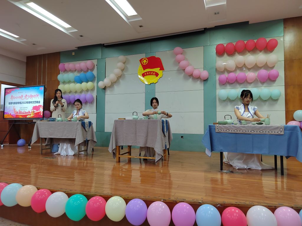 在“青春”篇章,淳朴嘹亮的《万泉河水清又清》拉开晚会序幕;《美丽新疆》充分展现了地旅学院少数民族学子良好的精神风貌;大学生礼仪文化协会选送的茶艺表演《花津茶事》让现场观众领略了中华历史悠久的茶文化。