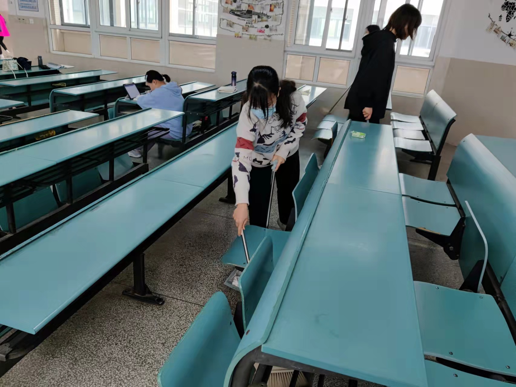 为引导青年学生向劳动者致敬,向劳动者学习,以实际行动践行“崇尚劳动、热爱劳动、辛勤劳动、诚实劳动”的劳动精神和“奉献、友爱、互助、进步”的志愿服务精神,5月1日上午,地旅学院入党积极分子们结合“微服务”“我为师生办实事”实践活动,在教学楼与学院实验楼开展志愿服务活动。地旅学子们充分展现了不怕脏、不怕苦、不怕累,敢于冲在前面、敢于抢挑重担的精神风貌,有的用扫帚清扫地面,有的忙着把从桌椅中捡出来的废纸、塑料袋等扫进垃圾箱,有的擦拭座椅……大家热情高涨,以劳动为荣,乐在其中,用实际行动让我们的校园环境更加美好,给师生创造愈加温馨、舒适的学习环境。