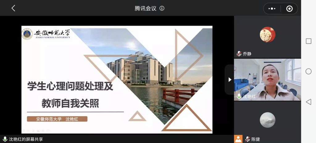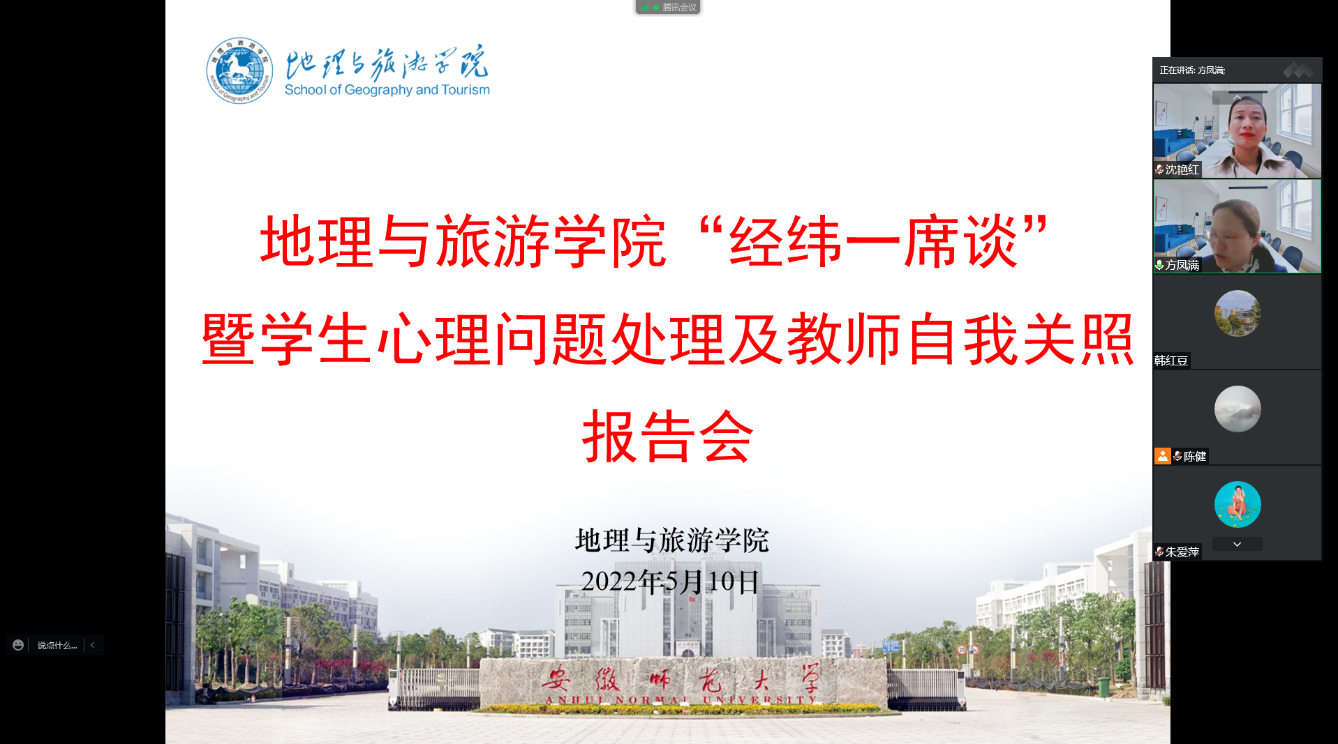 为贯彻落实“三全育人”理念,深入推进全员心理育人工作,切实形成育人合力、提升立德树人实效,5月10日晚,地旅学院邀请校大学生心理健康教育中心副主任、心理咨询师沈艳红为全院教职工做心理健康专题线上培训。会议由学院院长方凤满主持,学院全体教职工共计110余人参会。