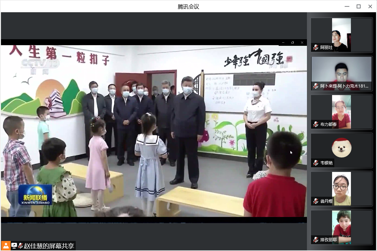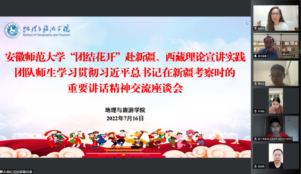 7月12日至15日,中共中央总书记、国家主席、中央军委主席习近平在新疆考察。7月16日,地旅学院积极行动,组织该院国家级暑期社会实践重点团队——beat365英国官方网站“团结花开”边疆少数民族学子赴新疆、西藏理论宣讲实践团队的师生,通过线上开展学习贯彻习近平总书记在新疆考察时的重要讲话精神交流座谈会,地旅学院党委副书记乔静、团委书记陈祥云、团队指导教师代表以及全体队员参会,会议由陈祥云主持。