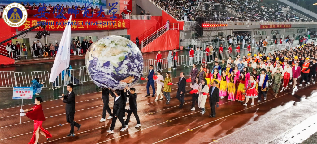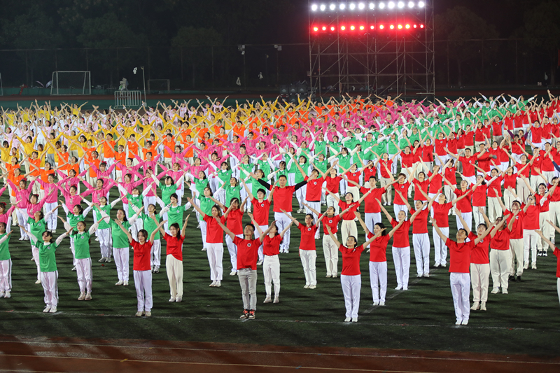 高歌曼舞传扬体育精神。文艺表演环节百花齐放,惊喜不断。舞龙表演威风凛凛,气势磅礴。百余名师生制作80余只非遗鱼灯,舞活一幅鱼灯国画。民族健身舞《梦圆中国》激情四射、《少年中国说》武术表演意气风发、拉丁舞《时代青春》动感十足。在千人齐舞《一起向未来》表演中,地旅学院排舞队的队员们以整齐划一的动作,挺拔昂扬的身姿为全体观众带来一场精彩纷呈的表演。