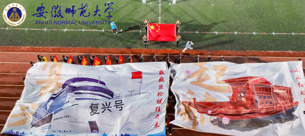 铿锵步伐踏出青春朝气。紧随着学校红旗方队,地旅学院作为学院方阵率先入场,步伐坚定,气势如虹,激情豪迈,以热情饱满的姿态向全校师生展示地旅学子昂扬向上的精神风貌。“经天纬地,弘道明理,青春向党,勇毅前行!”响彻全场的口号昭示着地旅必胜的决心。富有专业特色的荧光地球被高高举起;身着绚丽服饰的少数民族同学别具一格,围成一圈载歌载舞,彰显了民族团结的和谐气象;礼仪队身着红色旗袍流转光华,退伍学生身披绿色军装英姿飒爽。主席台前,地旅学子以鲜艳的展板,流动的巨幕献礼二十大,一幅图卷徐徐展开,一艘红船在穿越历史沧桑巨变后终成巍巍巨轮的壮阔历程跃然于纸上,体现了地旅学子始终坚定理想初心,付绚丽韶华汇入新时代的浪潮,永远跟党走,奋进新征程,以饱满自信的精神面貌做出“青春奋斗,强国有我”的承诺,彰显了新时代青年的使命担当。