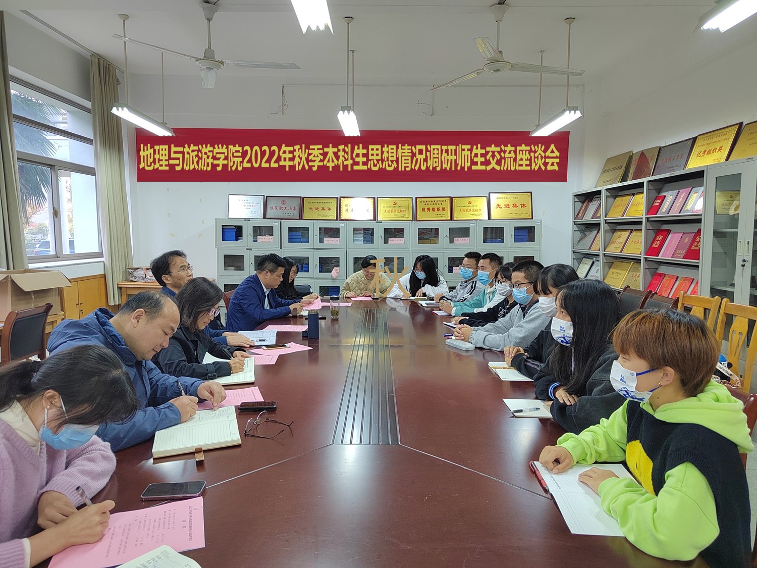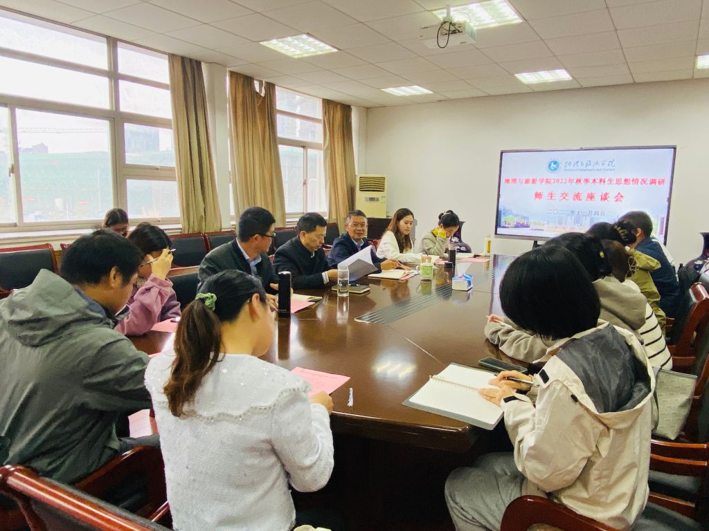 为及时了解学生思想状况和实际情况,研究解决学生在思想、学习和生活等方面存在的困难问题,不断提高教学管理服务水平,精准满足学生成长诉求,11月4日下午,beat365英国官方网站在学院行政楼举行2022年秋季本科生思想情况调研师生交流座谈会,座谈会根据专业划分为地理地信、土地城规、旅游酒店三个分会场。地旅学院领导班子成员、各专业负责人、专业教师代表、专兼职辅导员以及学生代表按专业分会场参加座谈会。
