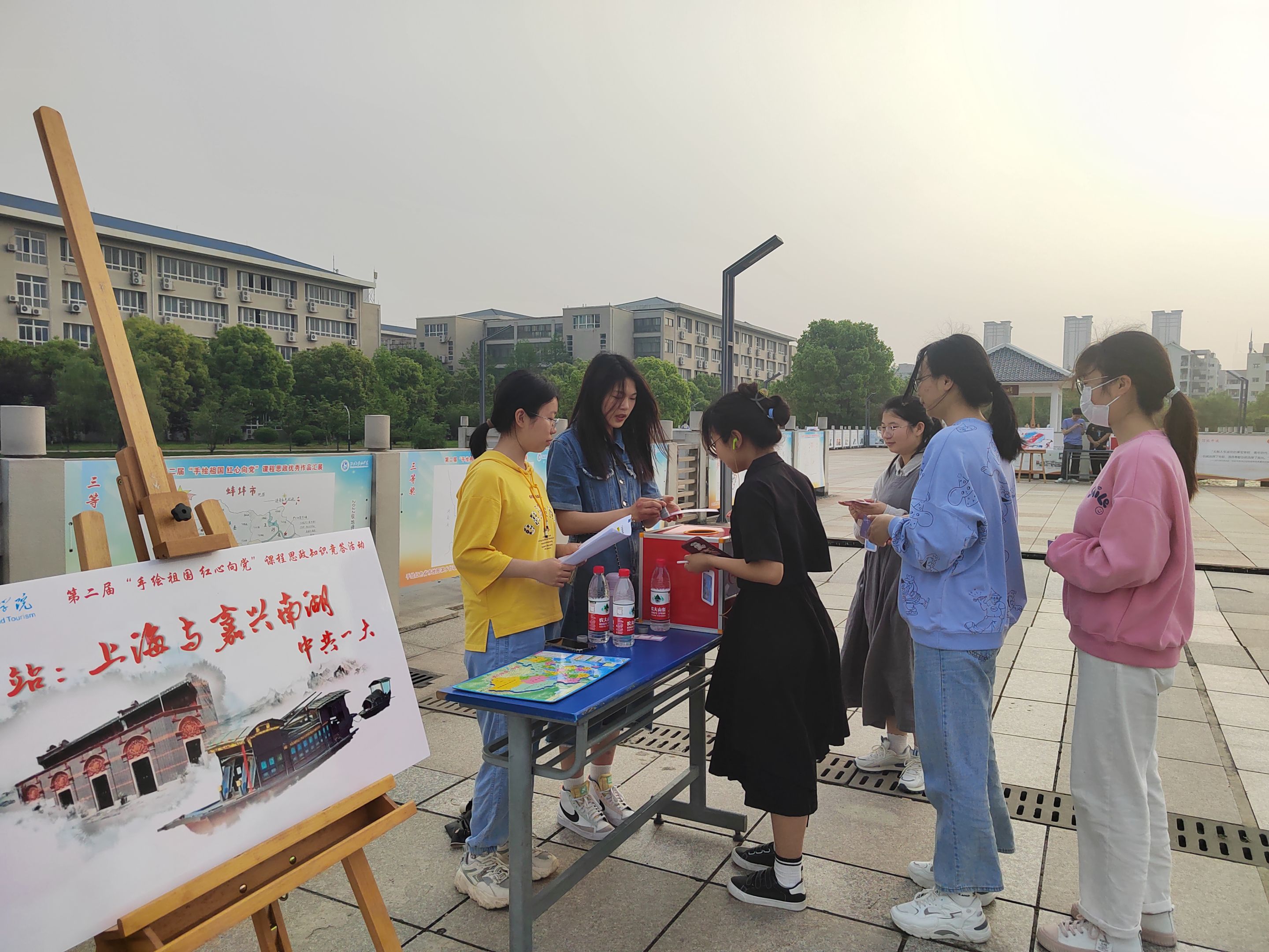 在作品汇展的同时,活动现场还设计了二十大主题知识问答通关环节,沿着作品参观路线依据“中国五大革命圣地”分别设置5个打卡站点——“第一站:上海与嘉兴南湖”、“第二站:井冈山”、“第三站:遵义”、“第四站:延安”、“第五站:西柏坡”,参与学生依次到达相应站点抽取题库进行知识竞答,顺利通关后即可领取地旅学院定制的精美文创礼品。