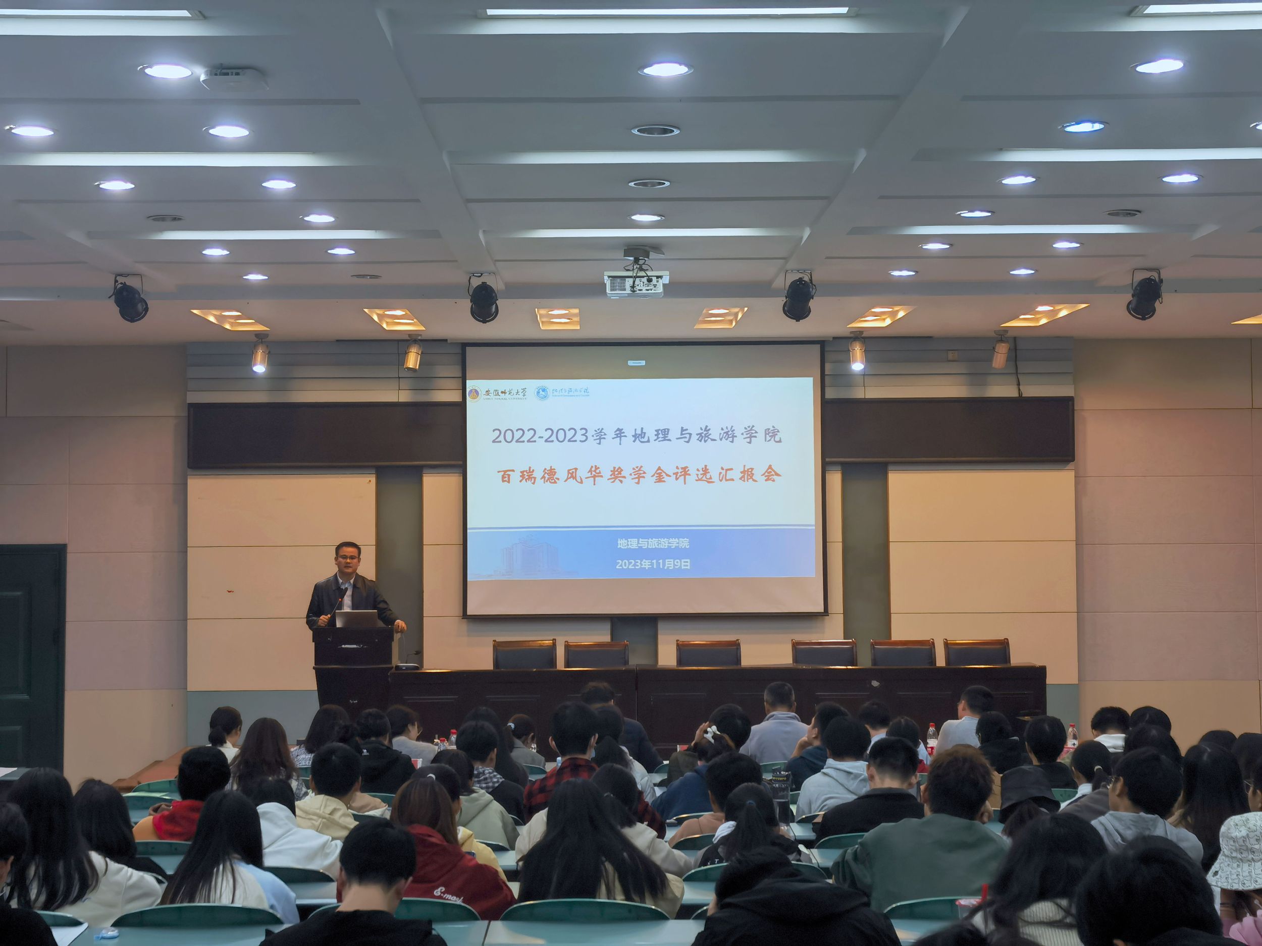 11月9日晚,beat365英国官方网站在学院实验楼101报告厅举行百瑞德风华奖学金暨“十佳学生骨干”评比汇报会,学院党委副书记付勇、地理科学专业教师杨立辉、旅游管理专业教师阮陵、地理信息科学专业教师徐培培、土地资源管理专业负责人费罗成、城乡规划专业教师黄秋实以及学院团委负责人和专兼职辅导员代表出席此次活动并担任评委。会议由2022级地理科学(师范)专业李钰莹同学主持。