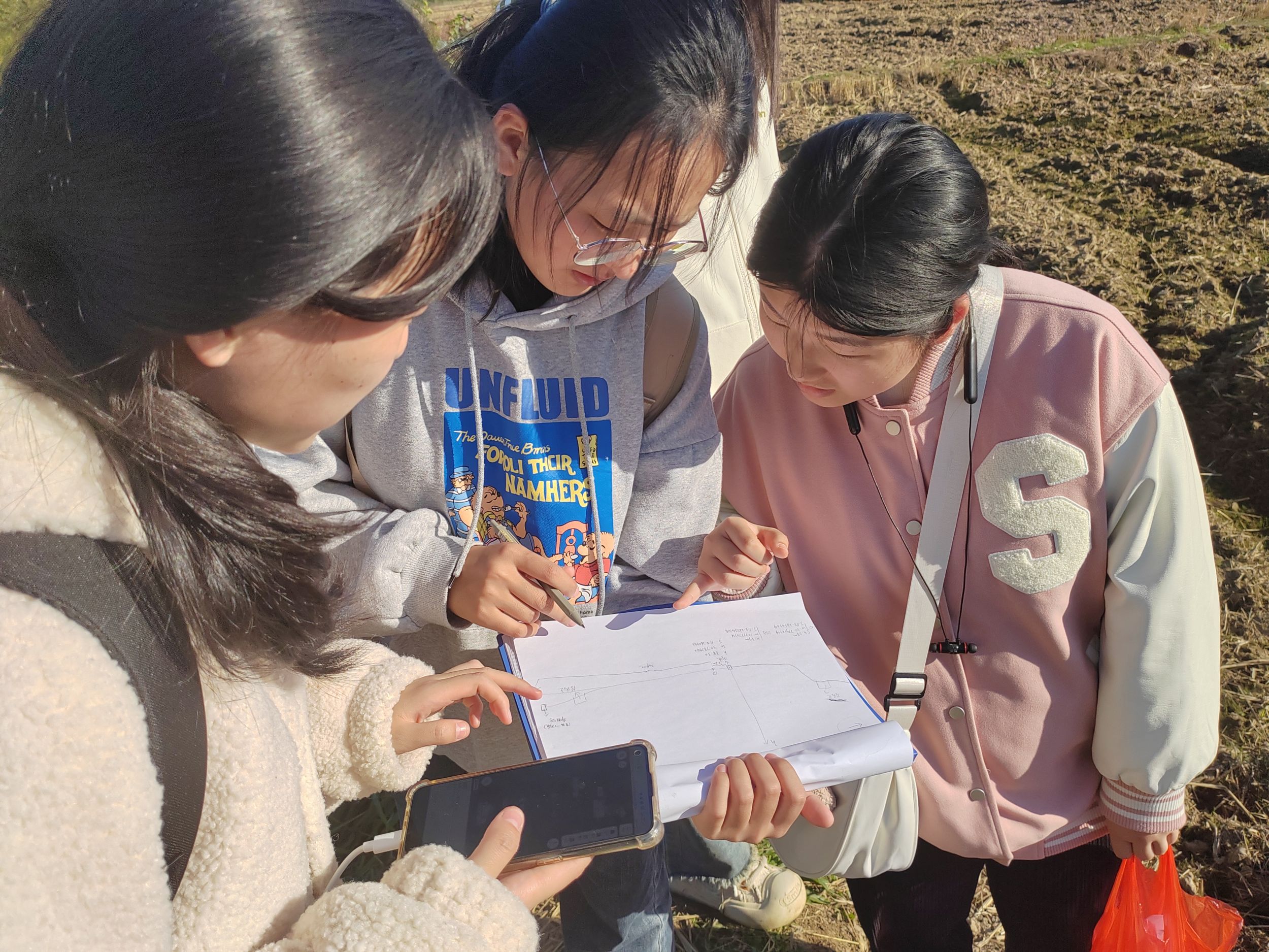 下午,全班分为四组,按组分别前往从冲头到冲尾划分的四个区域。各组成员分工合作,采集土样并记录数据。同学们按照余健老师教学的方法,独立观察得出结论,画出土壤剖面图及采样区域横断面图。调查期间,三位老师在旁指导,答疑解惑。