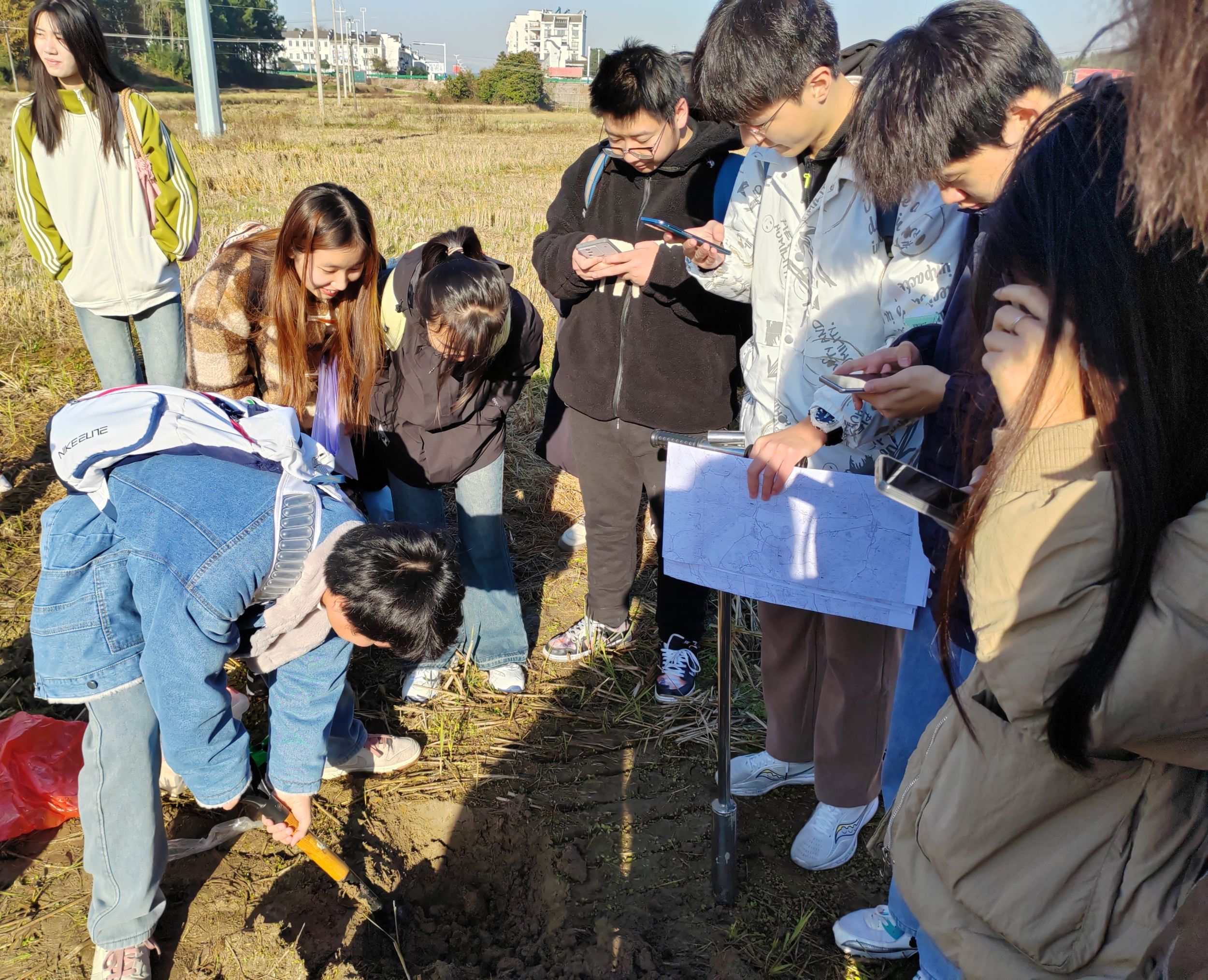 在余健老师的指导示范下,同学们在水田、水浇地等不同土地利用类型的土地上挖掘出50×50cm,深度60cm的土坑,观察裸露出的土壤剖面图。通过颜色和紧实度等土壤性状划分土层,并在采取土样后利用稀盐酸和邻菲罗啉等化学试剂辅助观察。观察完成后,同学们将土坑复原。