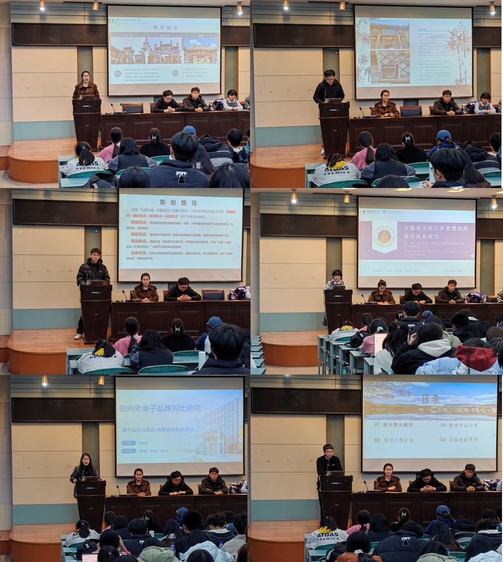 会上,李馨怡等人围绕“旅游目的地认知实习”这一主题,结合专业认知实习经历,分别从“旅游小企业经营特征调查与徽文化的非遗传承利用”“基于游客感知的品牌个性与市场定位”“旅游规划与策划调查分析课题”“安徽省及浙江省智慧旅游服务体系研究”“国内外亲子品牌对比研究”“旅游景区、街区和度假区质量调查”等六个方面进行成果汇报分享,内容涵盖旅游管理专业研究前沿、国内旅游热点景区发展现状、专业认知实习组织实施等方方面面,为旅游管理专业全体新生进行了一场主题鲜明、内涵丰富、干货满满的高质量经验分享,帮助同学们深刻了解和全面认识了什么是旅游目的地认知实习、怎么进行旅游目的地认知实习,增进了同学们对旅游管理专业的思想认知、情感认同,为接下来的专业学习、认知实习奠定坚实基础。