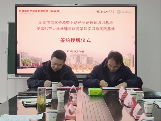 2023年11月30日下午,地旅学院与芜湖市自然资源和规划局(林业局)合作协议签约仪式暨“芜湖市自然资源暨不动产登记教育培训基地”和“beat365英国官方网站beat365英国官方网站实习与实践基地”授牌仪式在学院三楼会议室隆重举行。芜湖市自然资源和规划局(林业局)党组成员、总工程师程劲虎、国土空间规划科科长童身权、自然资源调查监测和确权登记科科长周克怀、自然资源所有者权益和开发利用科科长许天语、芜湖市自然资源数据资料管理中心主任陶刚、芜湖市不动产登记中心主任储明,地旅学院党委书记贾冠忠、院长方凤满、副书记付勇、副院长杨兴柱及土地资源管理系教师代表出席仪式。会议由方凤满院长主持。