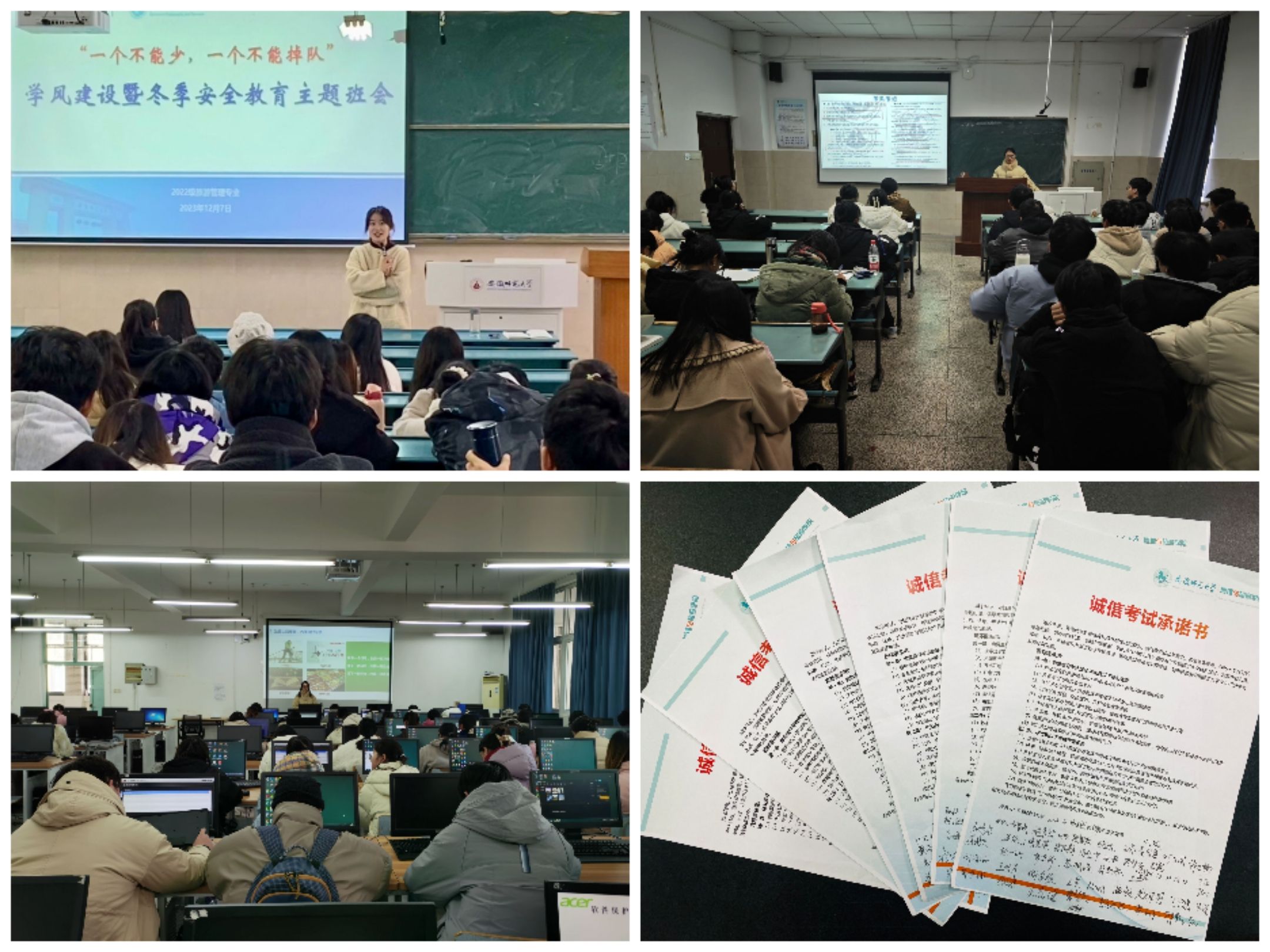 为严肃考风考纪,维护考试公平公正,加强学生考前诚信观念教育,各年级、班级陆续召开期末考试诚信教育主题班会,并结合学院“学八条”“考八条”等学风考风管理制度,教育引导学生树立“诚信考试,杜绝作弊”的思想理念,让同学们认识到要自觉遵守考试纪律,维护考试公正,以诚信考试为荣,作弊考试为耻。考试期间,学院领导班子带领全体辅导员做到每场考试前巡考、做好考前提醒,全程在场,确保学生做到在各类考试中不作弊,自觉遵守考试纪律,实现考试“零违纪、零作弊”。