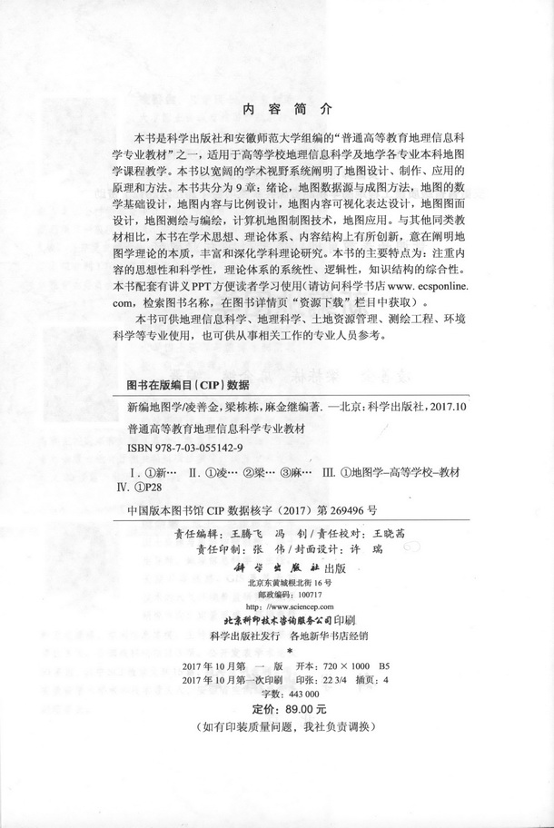 为了适应地理信息科学等专业本科地图学课程教学需要,编写出具有实用性、科学性、时代性的教材,科学出版社和beat365英国官方网站策划编写出版“普通高等学校地理信息科学专业本科系列教材”,《新编地图学》是其中的一部,也是第一部,由本院教师凌善金、梁栋栋、麻金继共同编著,凌善金还专门为该书题写了书名。本书共44.3万字,于2017年10月由科学出版社正式出版。该书共分为九章,分别为绪论、地图数据源与成图方法、地图数学基础设计、地图内容与比例设计、地理信息的可视化表达设计、地图图面设计、地图编绘与测绘、计算机地图制图技术、地图应用。为了方便教学,作者还专门为此教材精心设计制作了电子教案,由出版社免费发行。
