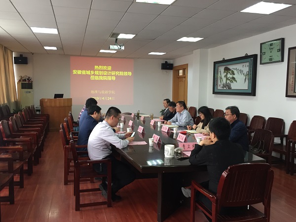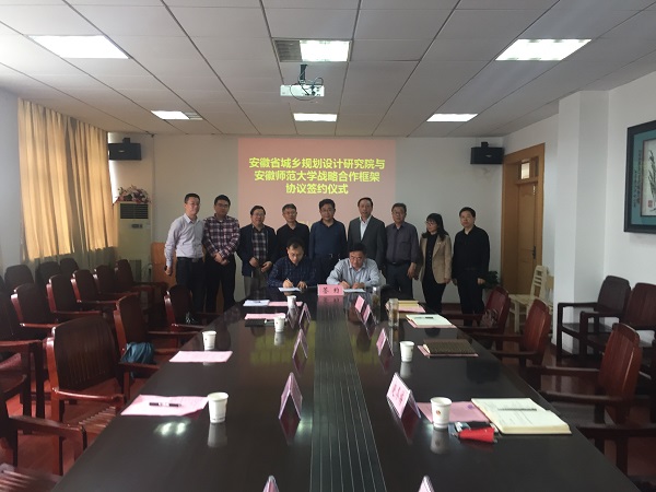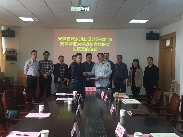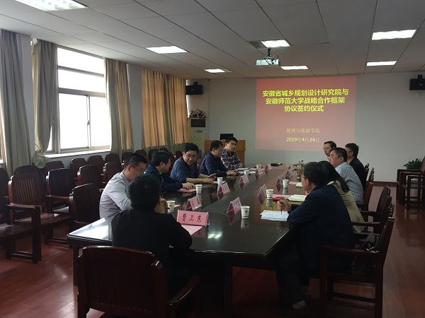 2019年4月24日上午,安徽省城乡规划设计研究院党委书记江叶青、院长姚本伦等一行5人莅临学院指导交流。beat365英国官方网站院长苏勤、党委书记贾冠忠、副院长曹卫东等领导教师参加协议签订仪式。仪式由贾冠忠主持。